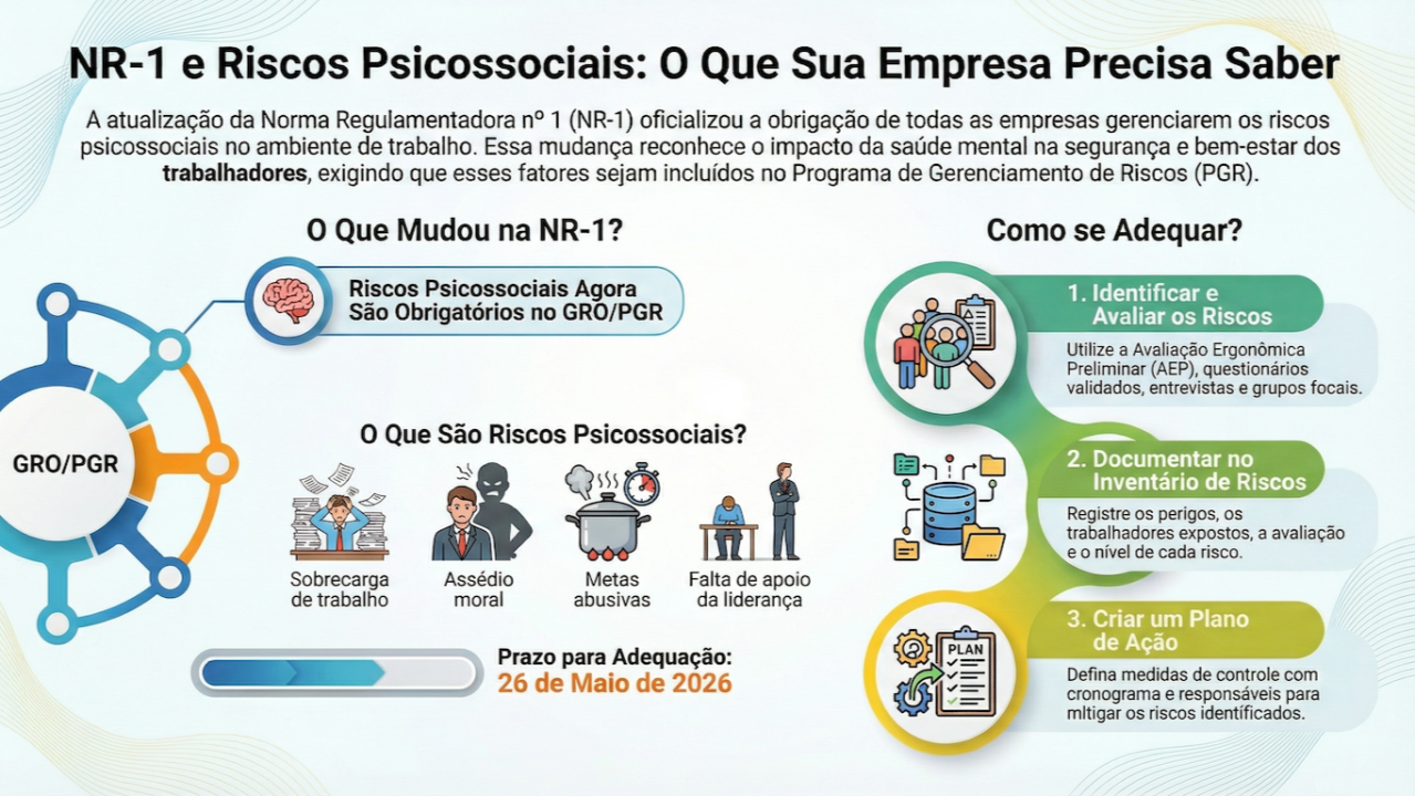 A atualização da NR-01 entra em vigor em 26 de maio de 2026 — e traz uma mudança profunda na forma como as empresas devem lidar com saúde mental no trabalho.